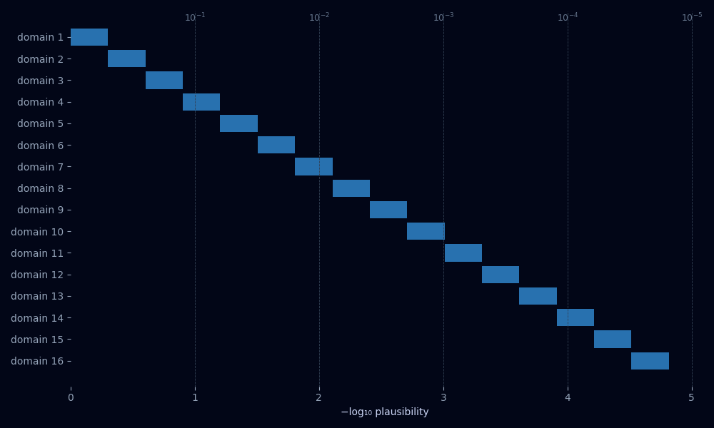 this is what exponential collapse looks like in the scale people are most familiar with. early steps dominate visually; later steps compress toward zero. that compression does not mean later domains “matter less” — it is a consequence of representing a multiplicative process on a linear axis.
